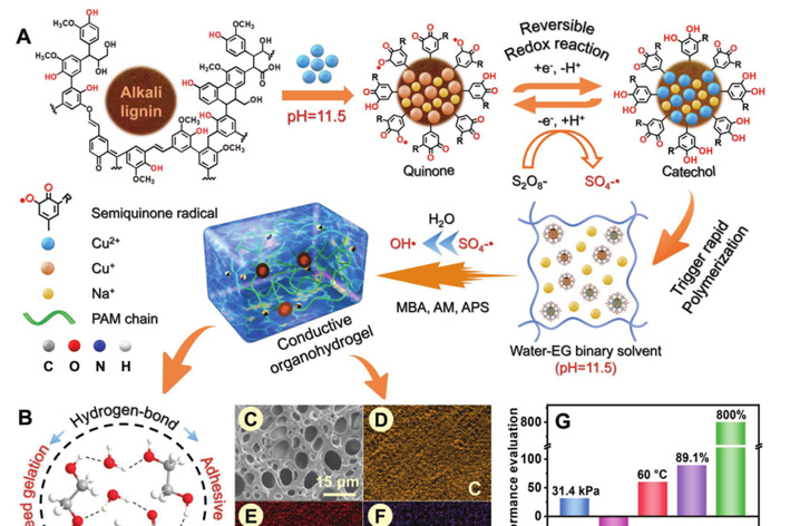 研究表明,在极端环境中耗时且耗能的聚合方法及差的适应性严重阻碍了导电水凝胶在电源领域的实际应用。有鉴于此,大连工业大学邵长优博士和北京林业大学彭锋教授团队本文设计了一种基于碱木质素(AL)大分子的简便通用的自催化体系(AL-Cu2+),用于在碱性水-乙二醇(…