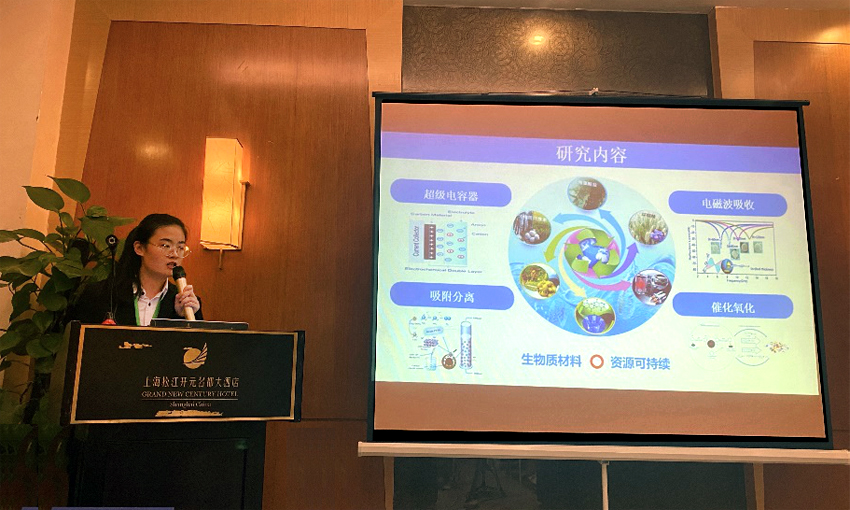 环境催化技术是去除水体中有机污染物的有效手段;而基于多相催化材料介导的高级氧化技术是当前环境催化领域的前沿研究。围绕生物质分子本征结构与组成特点,生物质化工研究团队近年来以生物质资源作为前体材料,定向合成了系列高效、稳定及环境友好的生物质基高级氧化催化材料(Microporous & Mesoporous Materials, Accepted,2021;Chemical Engineering Journal, 2020, 395, 125063;Journal of Cleaner Production, 2020, 250, 119585;Microporous and Mesoporous Materials, 2020, 293, 109810;ACS Sustainable Chemistry & Engineering, 2019, 7, 9237;ChemNanoMat, 2019, 5, 802;Journal of Cleaner Production, 2019, 236, 117630;Chemical Engineering Journal, 2018, 353, 746)。基于生物质化工团队前期研究基础,2019级研究生秦亚楠同学应邀做了题为《钴基生物炭活化过硫酸盐高效降解环丙沙星》的口头报告。报告中系统介绍了合成材料的催化性能,确立了催化性能的调控机制和手段,强化了对水体有机污染物的降解过程,为生物质资源的高值化利用方式提拱了可借鉴性思路。